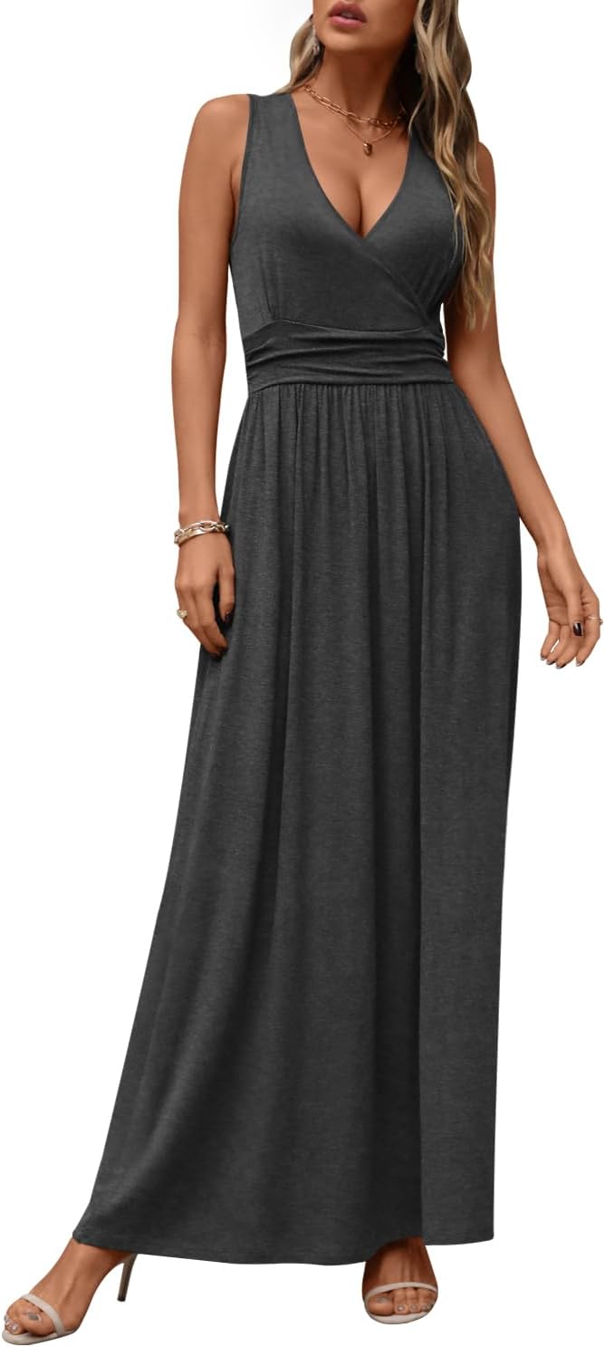 CATHY Women's Casual Sleeveless Deep V Neck Beach Waist Maxi Dresses with Pockets