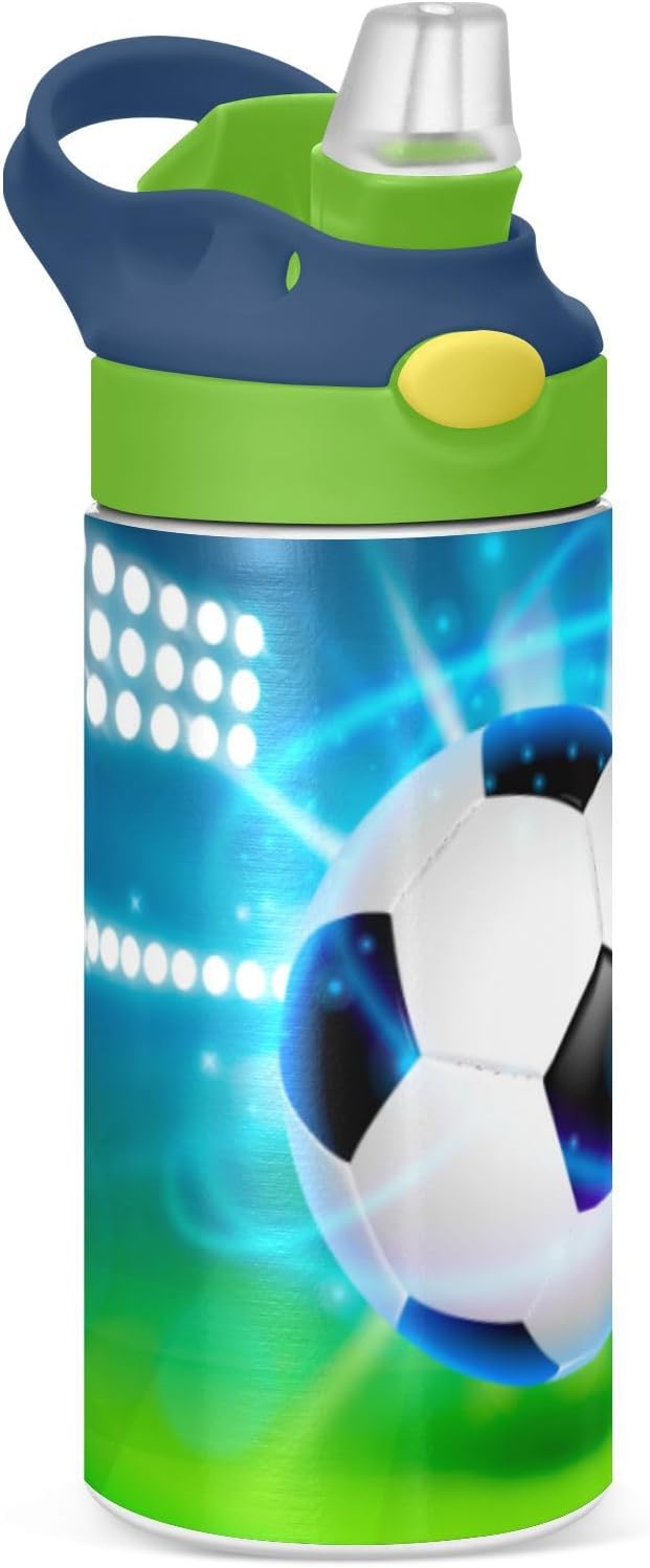 Soccer Ball on Field Kids Water Bottle with Straw Lid Insulated Stainless Steel Reusable Tumbler Leakproof Vacuum Boys Girls Toddler School Sports 12oz