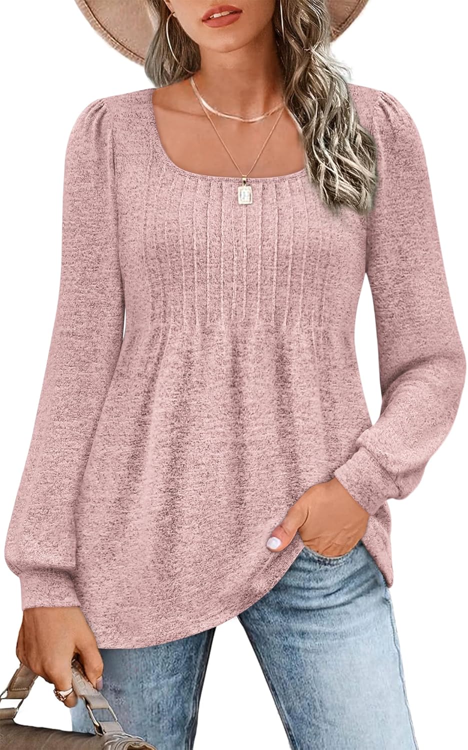 Zwurew Women's Puff Long Sleeve Shirts 2024 Trendy Scoop Neck Loose Fit Blouses Pleated Flowy Tunic Tops S-2XL