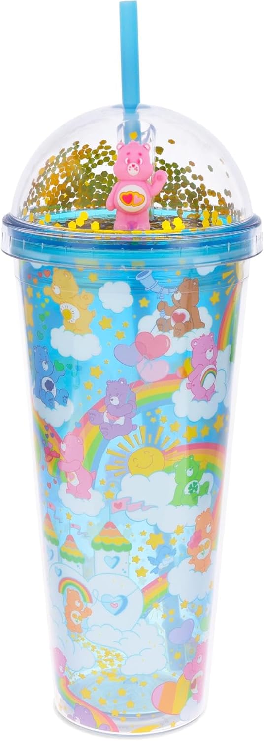 - SIZE AND MATERIAL: This 24-ounce Care Bears dome top tumbler is crafted from durable plastic and features a reusable straw, colorful lid, and vibrant artwork of the beloved bears among rainbows, clouds, and twinkling stars.