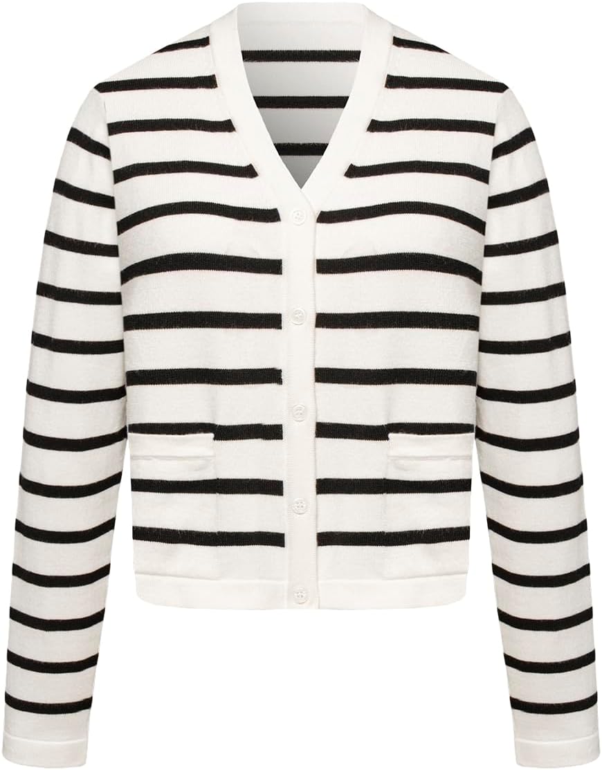 Women's V-Neck Long Sleeve Buttons White and Black Striped Knit Cardigan Sweaters
