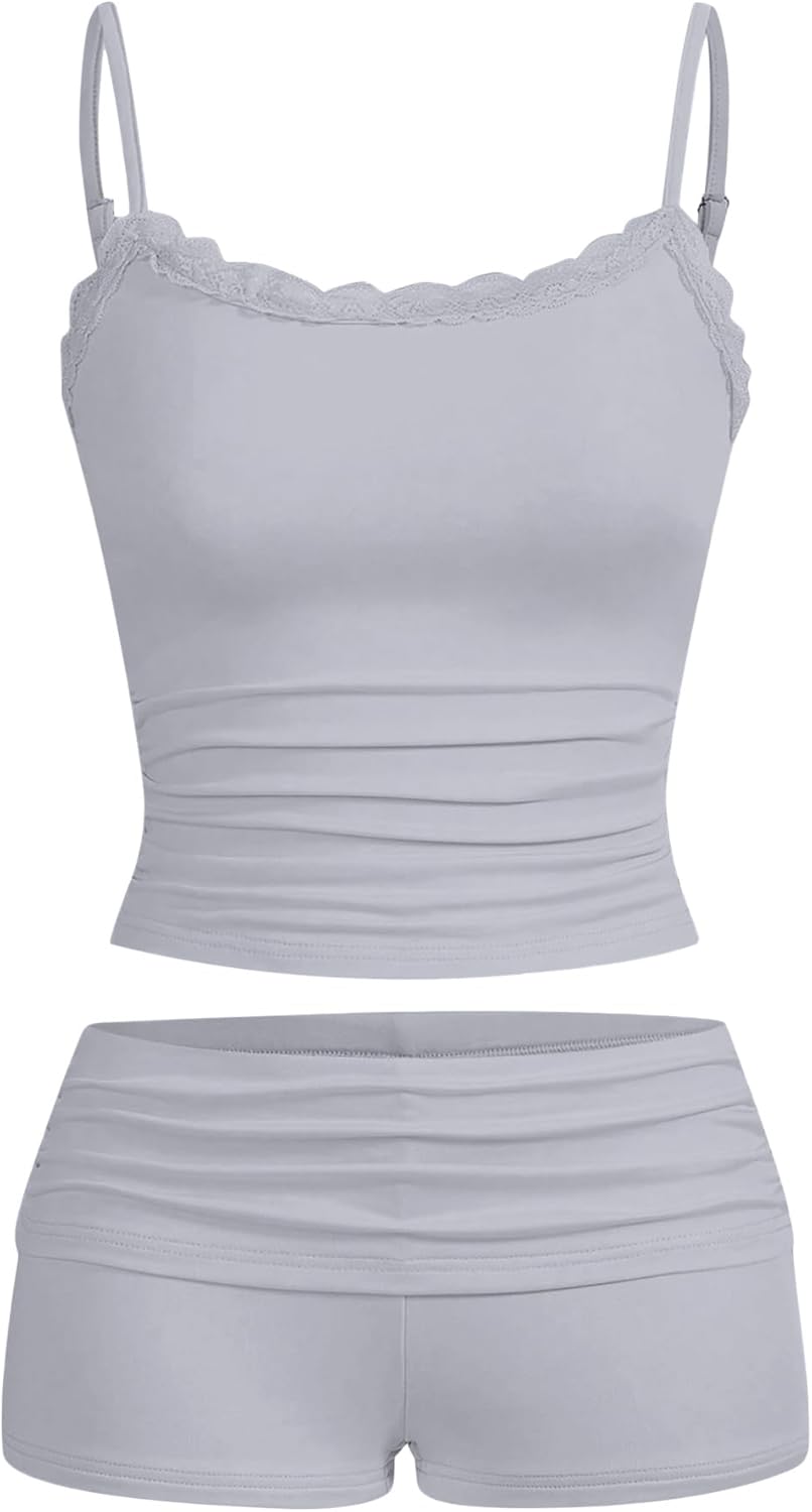 Hilinker Womens Sexy Pajama Set 2 Piece Lace Trim Cami Crop Tops and Ruched Shorts Summer Cute Pjs