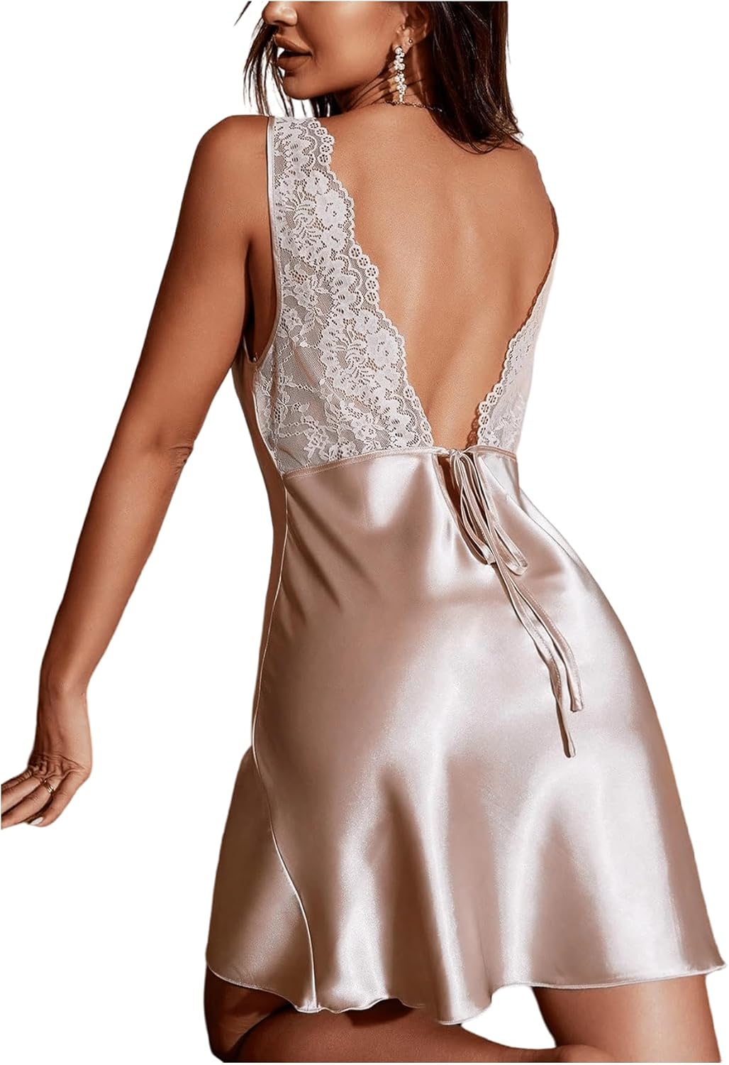 WDIRARA Women's Satin Lace Slip Dress Lingerie Backless Chemise Nightgowns Draped Neck Nightdress