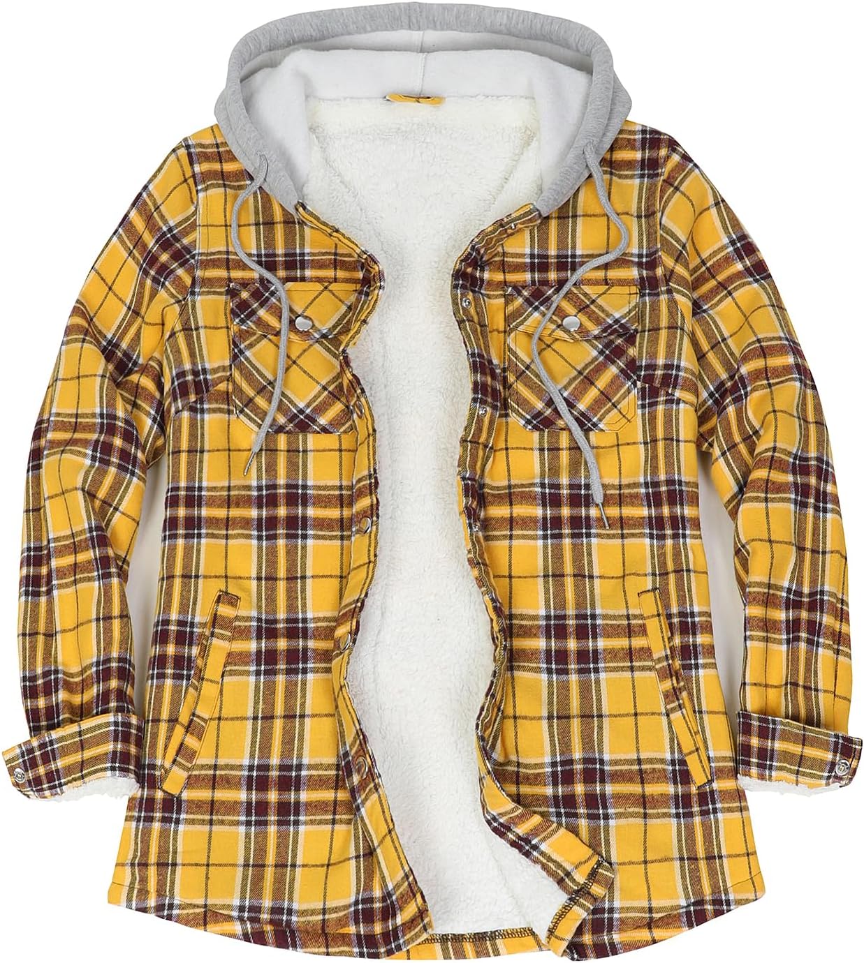 ZENTHACE Women's Flannel Shirt Jacket with Hood,Sherpa Lined Plaid Shacket Jackets,Snap Button Front