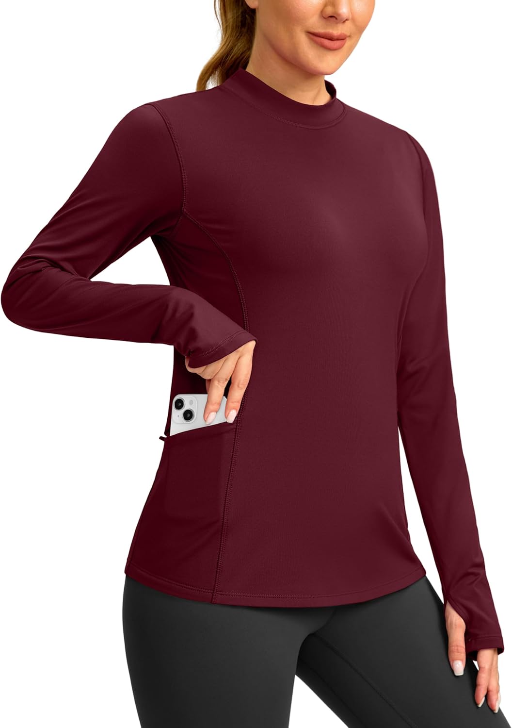 SANTINY Long Sleeve Thermal Shirts for Women Fleece Mock Neck Tops Winter Workout Running Gear with Zipper Pockets