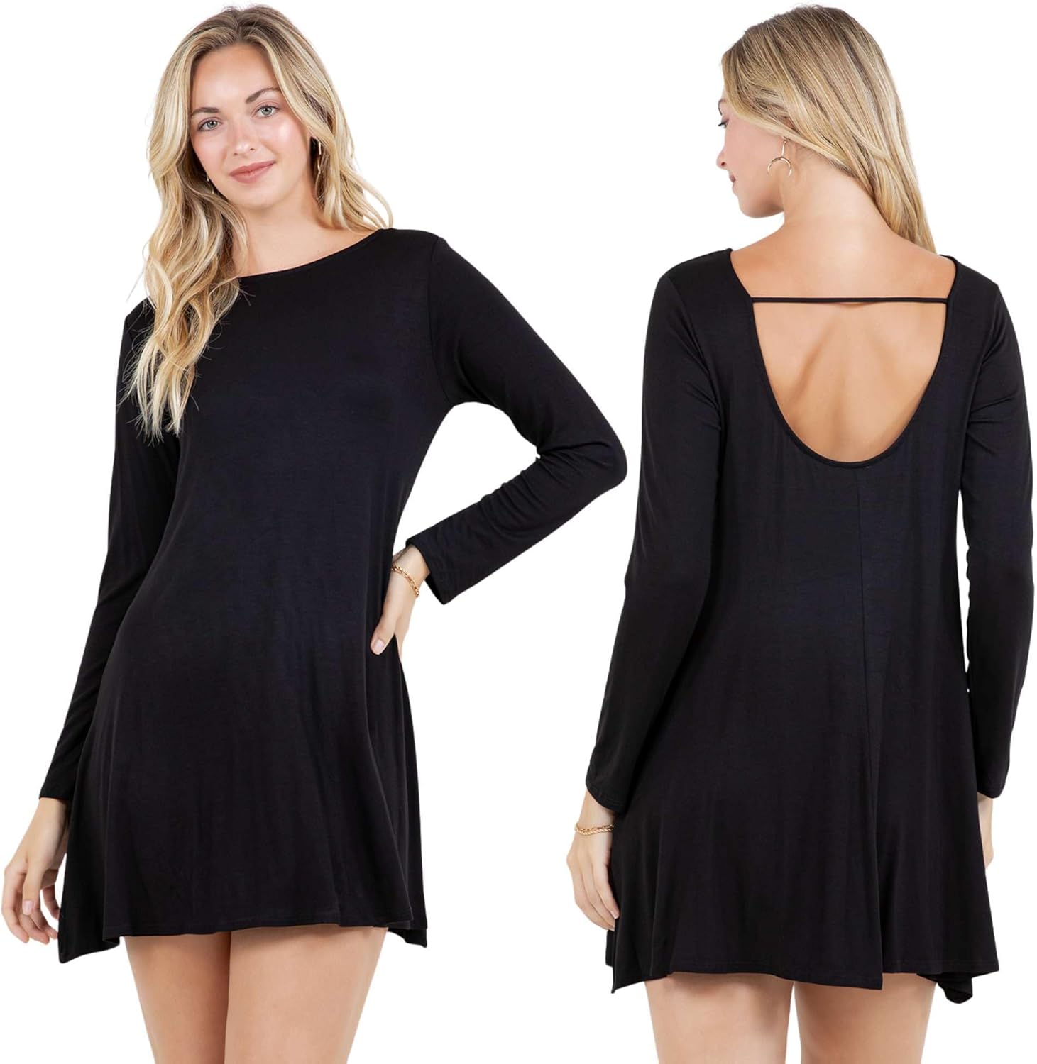 Azules Women’s Long Sleeve Tunic Dress – Casual Swing Mini Dress with Boat Neck & Scoop Back, Fall Winter Style