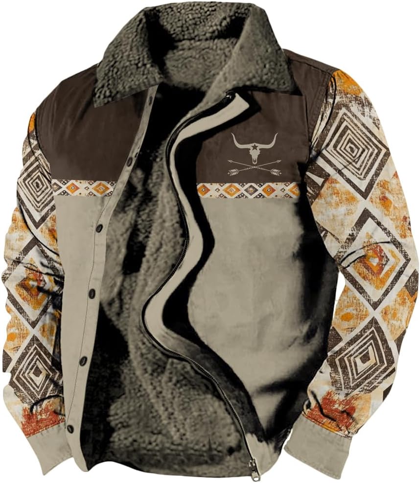 Western Aztec Jackets for Men Fleece Cowboy Shirt Jackets Cow Skull Graphic Coats Long Sleeve Jackets with Pocket