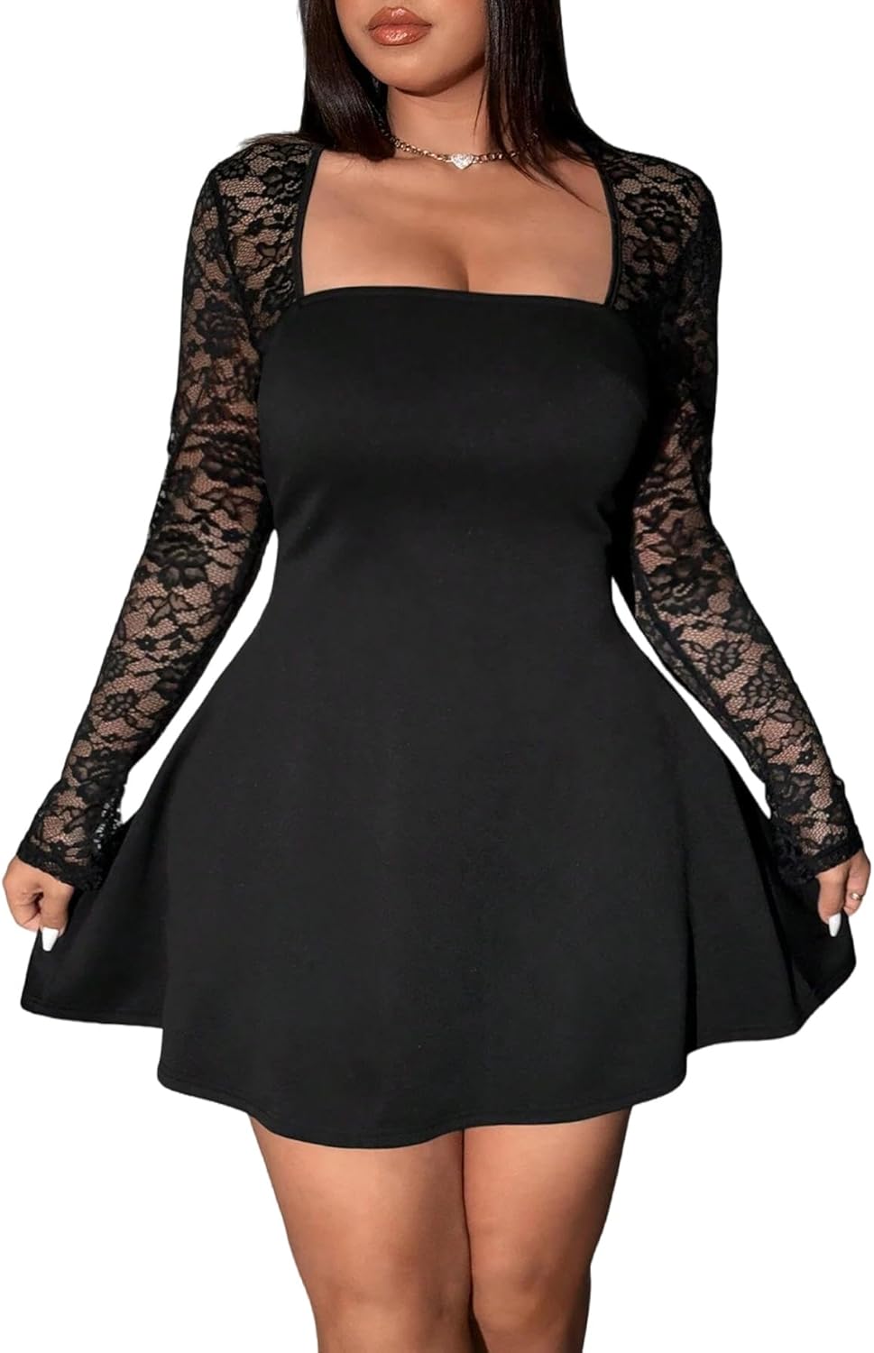 Women's Plus Square Neck Mesh Lace Floral Long Sleeve Flowy Mini Party Dress