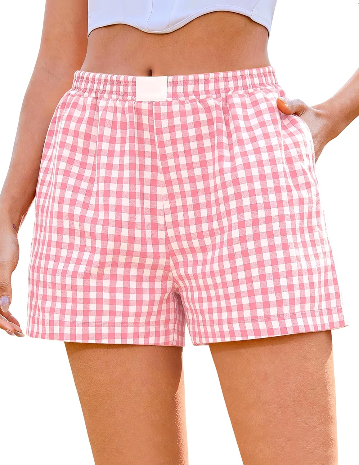Marvmys Womens Boxer Shorts Cotton Plaid Gingham Shorts Summer Elastic Waist Pajama Buttoms with Pockets