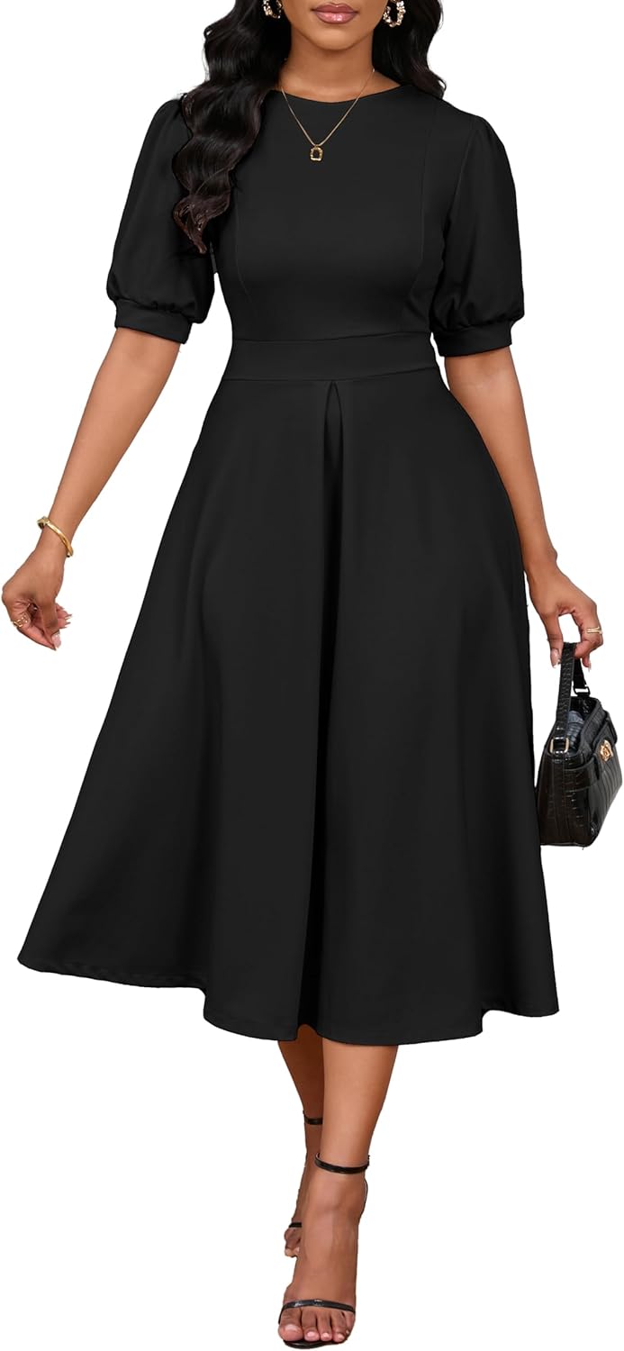 INR Elegant Dress for Women Puff Short Sleeves Long Dresses Cinched Waist A-Line Outfits
