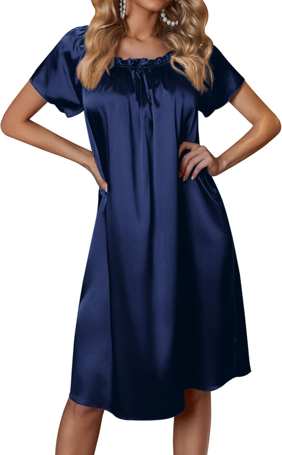 Ekouaer Women's Satin Silk Pleated Nightgown Loose Sleepwear Printed Nightshirt Short Sleeve Sleep Dress