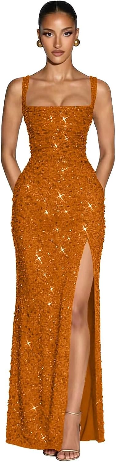 Sequin Mermaid Prom Dresses for Women 2026 Spaghetti Strap Square Neck Long Formal Evening Maxi Gowns with Slit