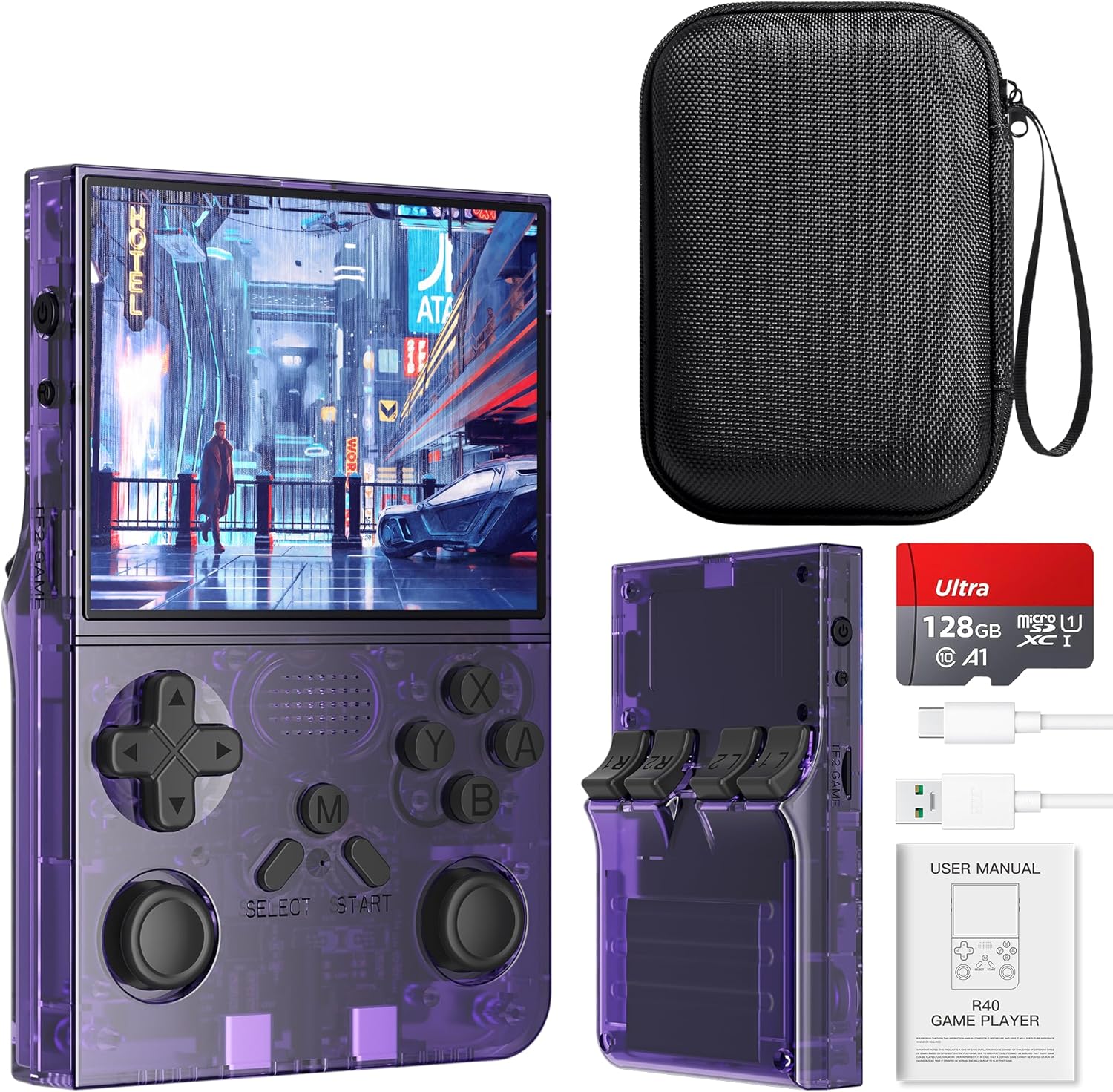 R40 Retro Handheld Game Console with Storage Case - Open Source System,3.5" IPS Screen, 18,000+ Classic Games, 128G TF Card, 3000mAh Battery, Portable Gaming Player for Travel, Purple