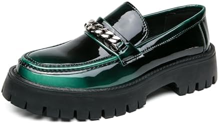 Men's Shiny Metallic Leather Slip-On Loafers with Chain Detail Lightweight Round Toe Chunky Sole Moccasins for Party Casual and Daily Wear
