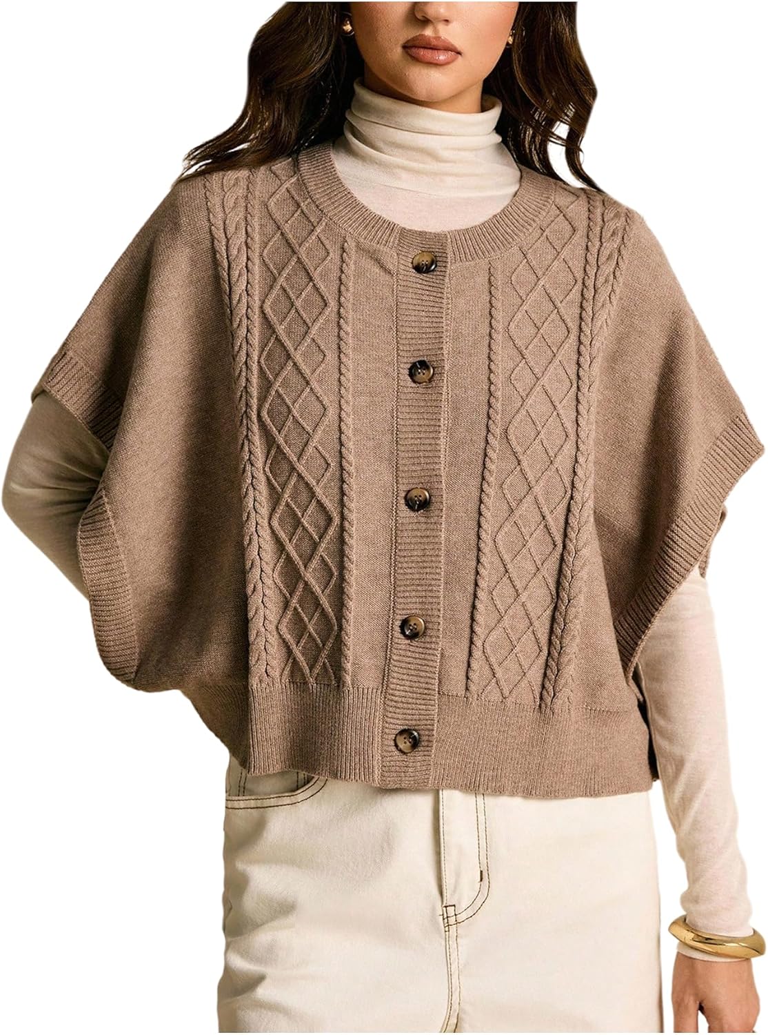 Women's Cable Knit Short Sleeve Cardigan Button Up Crew Neck Oversized Casual Knit Sweater