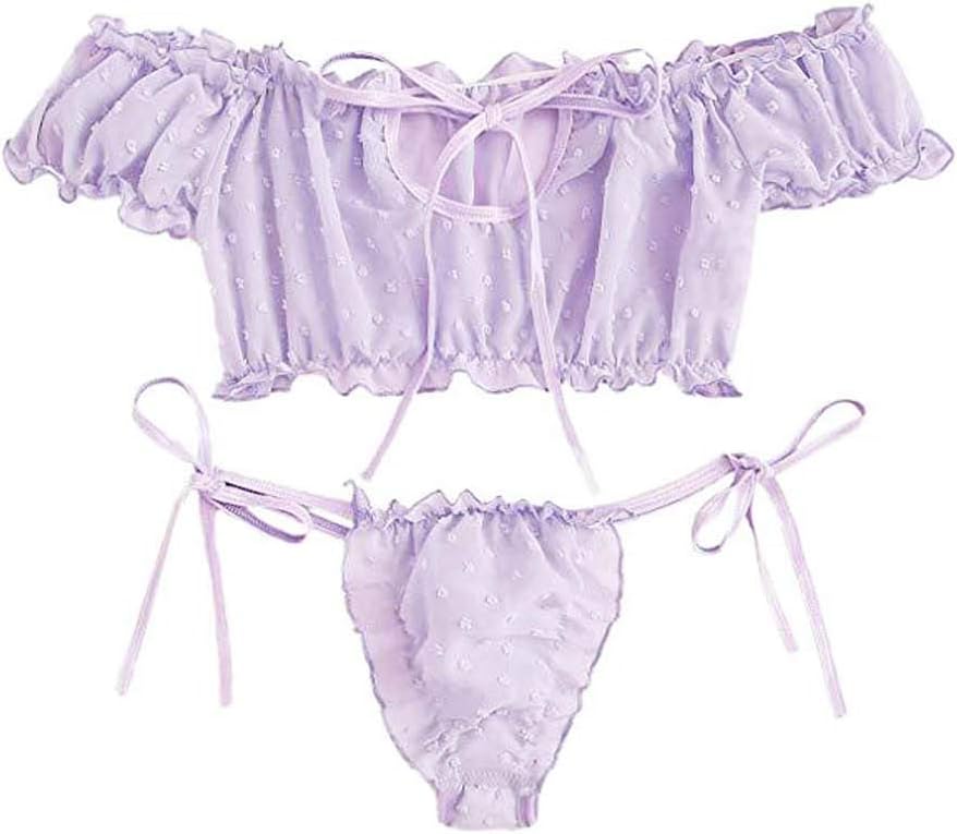 Women's Self Tie Ruffle Trim Dobby Mesh Lingerie- Sexy Underwire Cute Push Up Strappy Embroidered Sheer - Bra and Panty Set Ruffle Lingerie Set Mesh (Purple)
