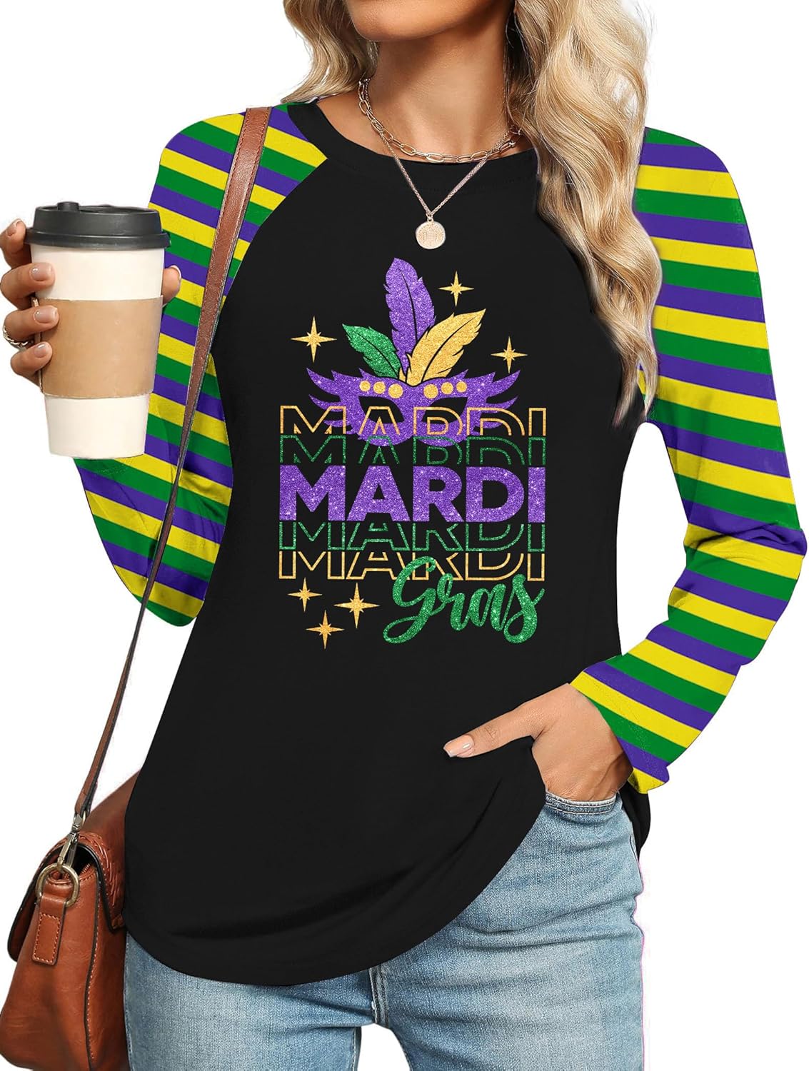 Mardi Shirts for Women: Carnival Glitter Mask Graphic T Shirt Mardi Outfit Fat Tuesday Long Sleeve Tops