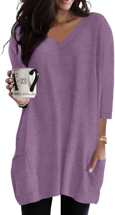Poetsky Womens Tunic Tops for Leggings with Pockets Vneck 3/4 Length Sleeve Shirt Casual Long T-Shirts S-3XL