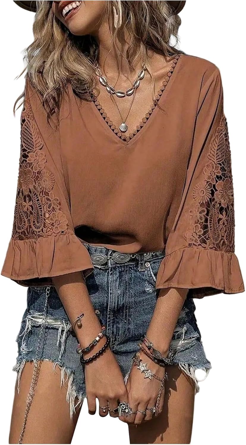 Floerns Women's Plus Size Hollow Out Flounce Sleeve Tops V Neck Dressy Casual Outfits