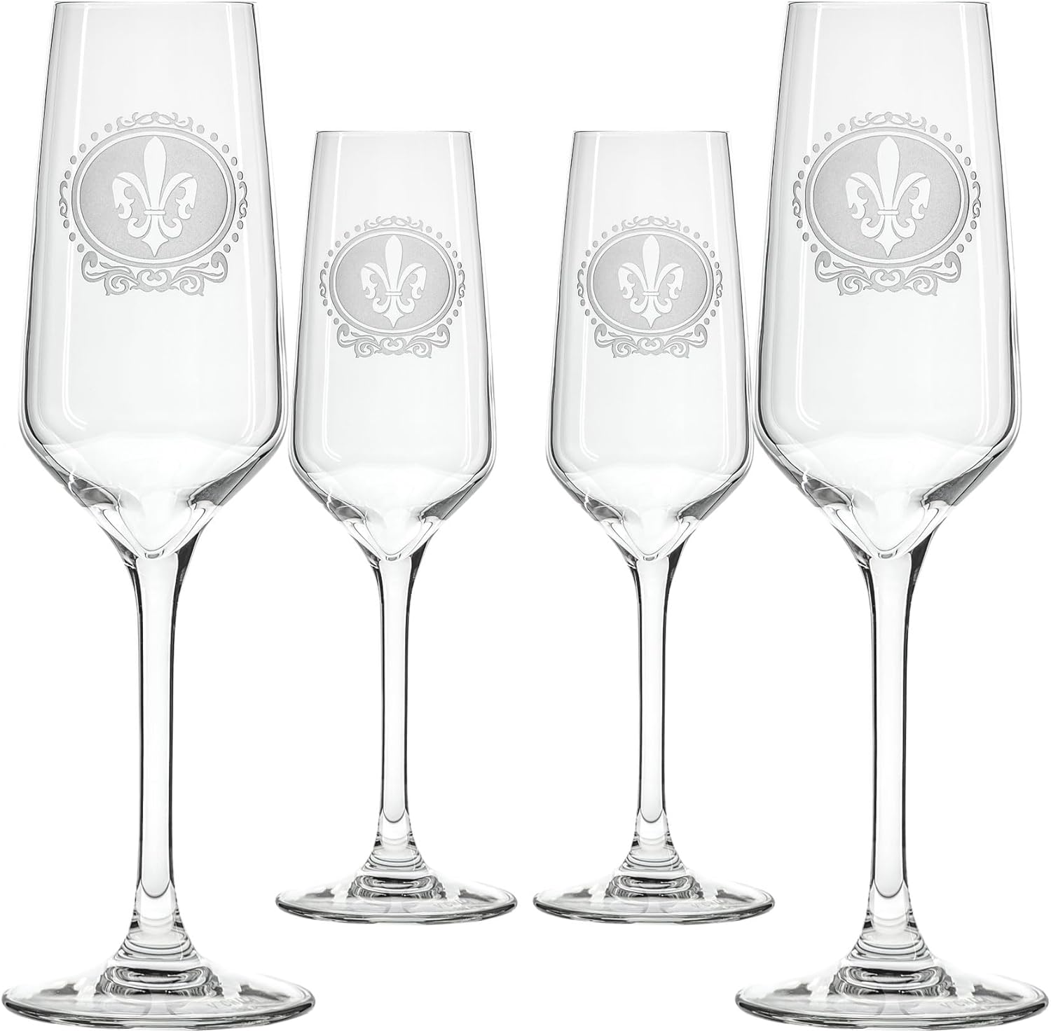 - ELEGANT FRENCH-INSPIRED DESIGN: Each flute features a deeply sand-engraved Fleur De Lis motif, adding royal sophistication to your glassware collection.