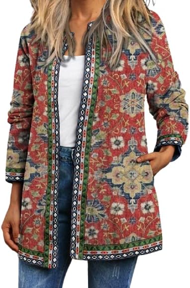 Akivide Women's Boho Ethnic Floral Print Long Sleeve Jacket Coat 2025 Trendy Fall Oversize Cardigan for Women with Pocket