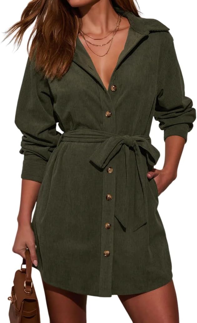 R.Vivimos Corduroy Cotton Mini Dress Fall Winter 2026 Casual Long Sleeve Button Down Belted Shirt Dress with Pockets