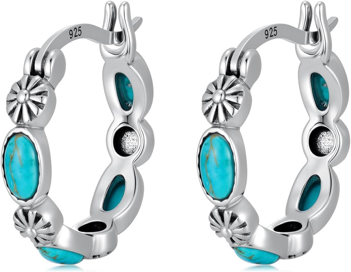 Natural Turquoise Oval Drop Dangle Earrings for Women 925 Sterling Silver Vintage Statement Teardrop Hoop Earrings Boho Western Flower Jewelry Gift for Birthday