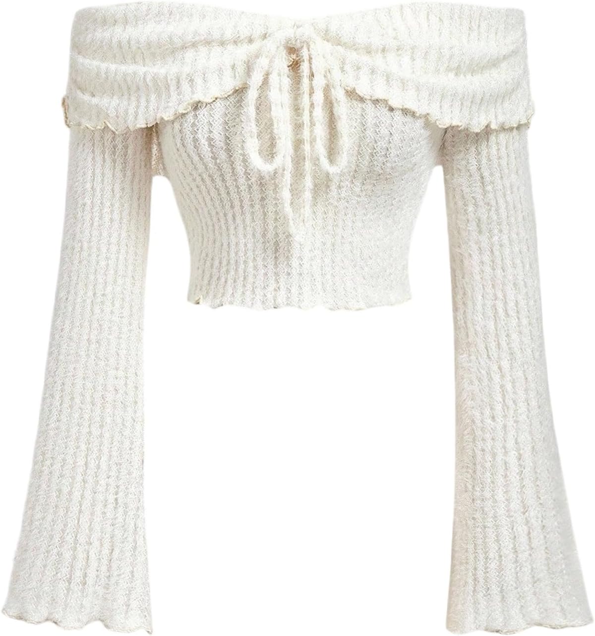 SOLY HUX Women's Off The Shoulder Long Sleeve Knit Top Tie Front Fitted Cropped T Shirts