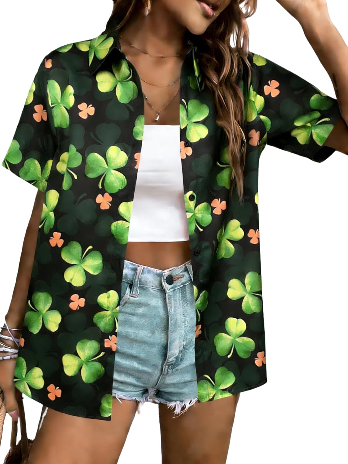 St Patricks Day Button Up Shirt Women Irish Lucky Clover Print Shirts Hawaiian Summer Vacation Short Sleeve Top Blouses
