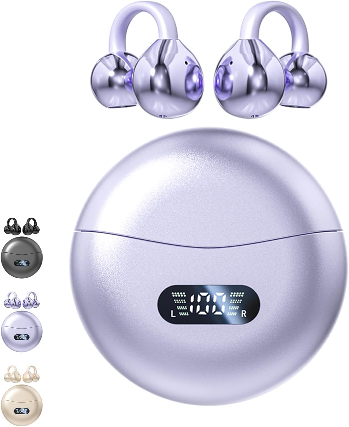 Clip on Earbuds Open Ear Wireless Bluetooth 5.4 Headphones with Mic,60H Play,Noise Cancelling,Waterproof,Sports Ear Buds,Comfortable for Small Ears & Glasses Wearers,Workouts (Purple)