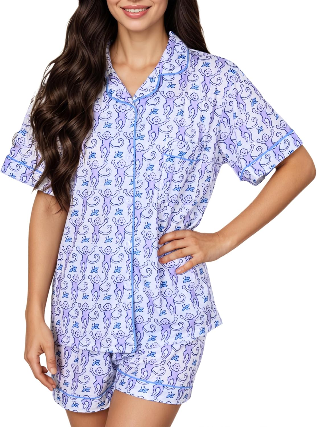 Women's Pajamas Set Button Down Ladies Summer Pajamas Monkey Printed Sleepwear Short Sleeve 2 Pc Pjs for Birthday Gift