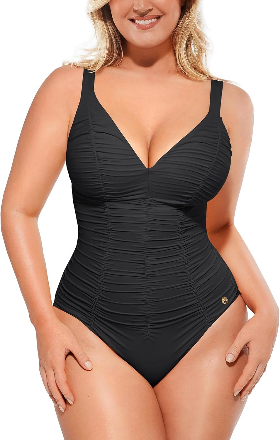 Shapellx Womens One Piece Swimsuit Tummy Control Ruched Slimming Swimwear Bathing Suit with Adjustable Lace-Up Back