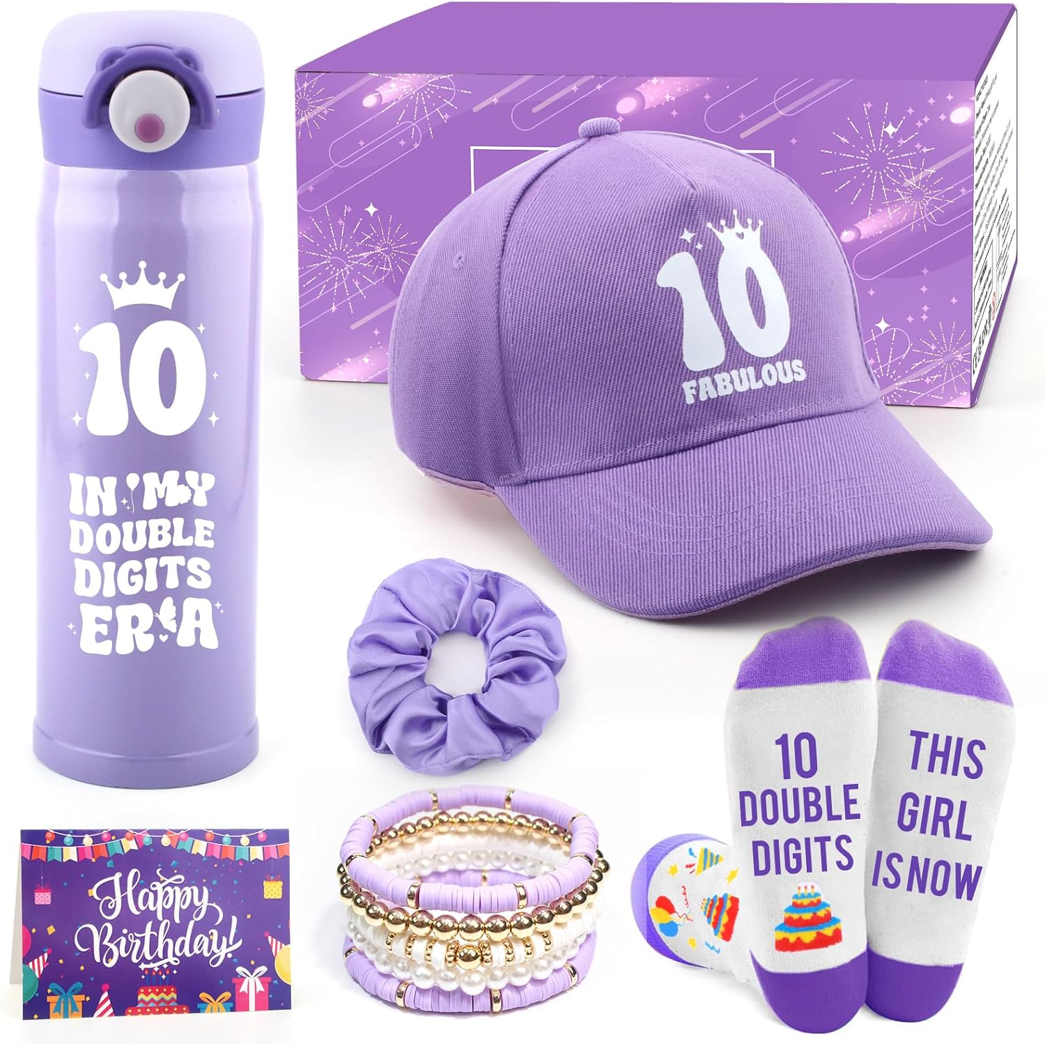 - 【BIRTHDAY GIFT FOR 10 YEAR OLD GIRL WITH SURPRISES】 The 10 year old girl birthday gifts set contains 6 pieces! 1x purple stainless steel woter bottle with "IN MY DOUBLE DIGITS ERA" printed on it, 1x personalised baseball cap, 1x creative bracelet (5 in total, 1 gold, 2 white, 2 purple), 1x soft and cosy socks, 1x cute purple hair band, 1x thoughtful birthday card! Each gift represents your love and sincere wishes for your girl.(All gifts in a purple gift box)