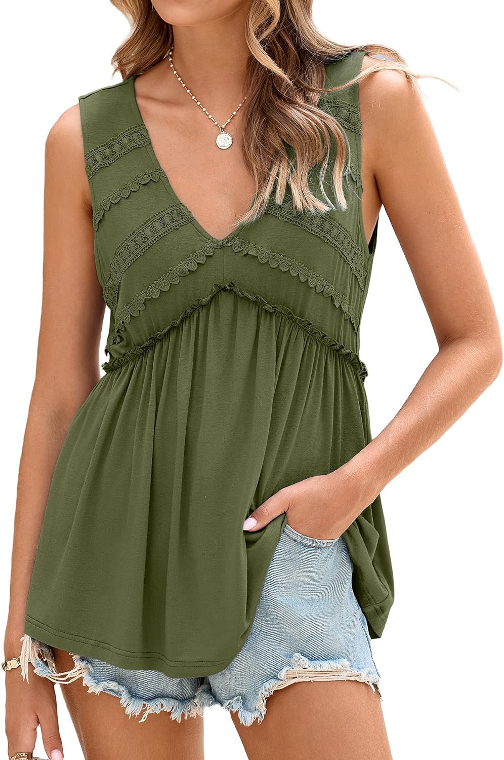 Glamaker Women Summer Tank Tops Babydoll Beach Lace Peplum Tops Boho Flowy Sleeveless V Neck Casual Tunic Shirts