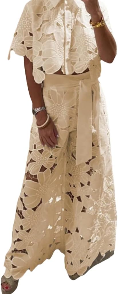 NIFTRIRY Outfits for Women 2 Piece Sets Lace Crop Shirt with Wide Leg Pants Two Piece Sets for Women Dressy
