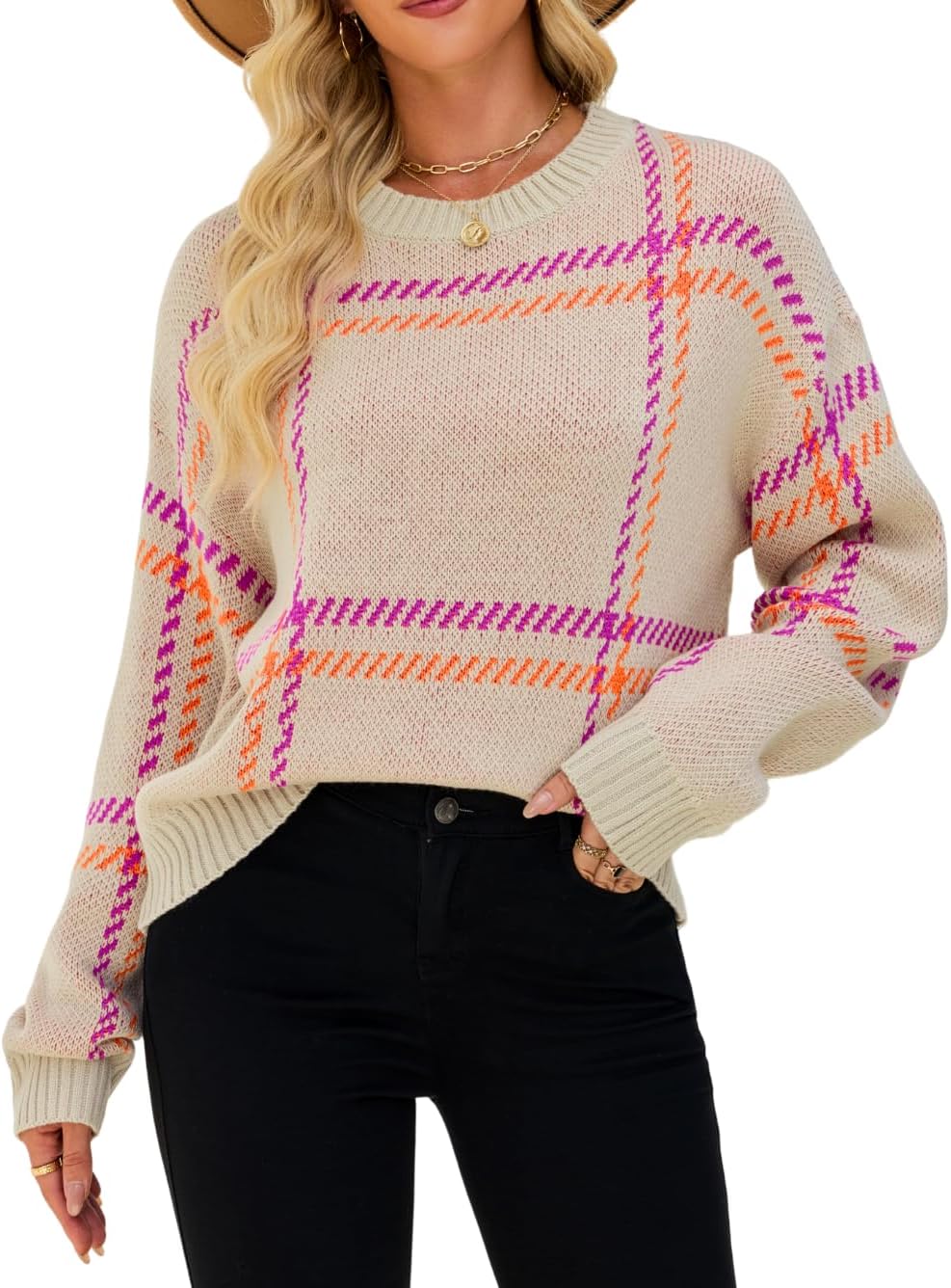 Checkered Pullover Sweaters, Crew Neck Long Sleeve, Fall Clothing, Lightweight Sweater for Women Striped Plaid