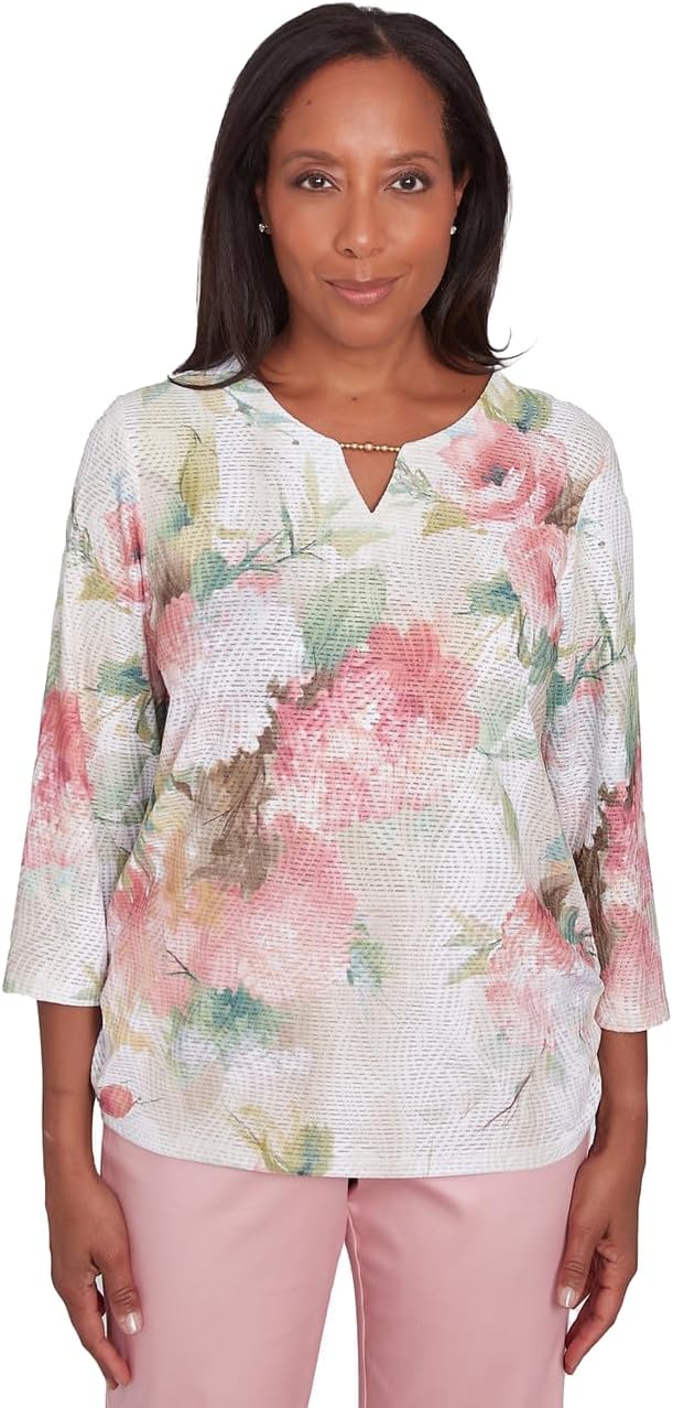 Alfred Dunner Women's Coming up Roses Ombre Medallion Three Quarter Sleeve Top