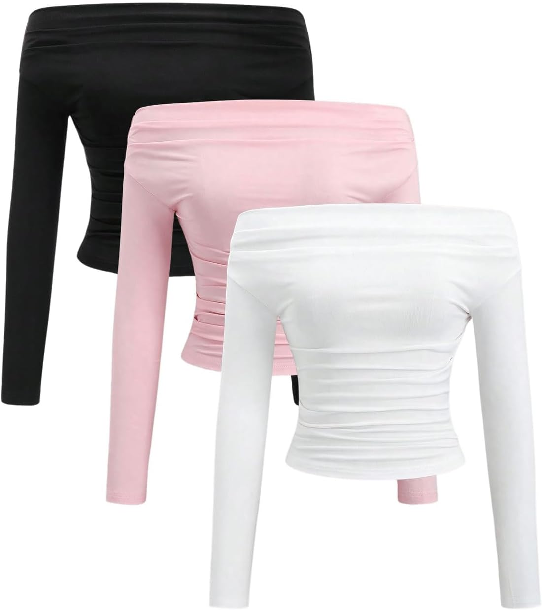 WDIRARA Women's 3 Pack Off Shoulder T-Shirts Long Sleeve Ruched Tee Shirts Slim Fit Tops
