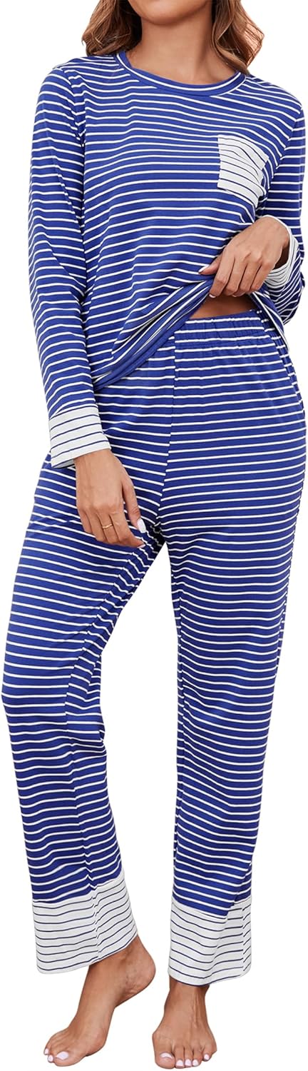 Womens Cotton Pajama Sets Stripe Long Sleeve 2 Piece Lounge Set Soft Pj Set Winter Loungewear Sleepwear with Pockets Maternity Postpartum Pajamas Dark Blue XL