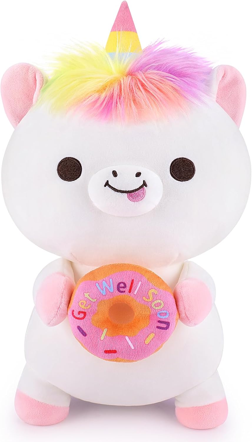 - 【Get Well Soon Stuffed Animal】Are you still struggling with emotional transfer for recovering patients?Our get well soon unicorn plush pillow is a good choice.A cute unicorn hug a doughnut plush,the plush donut has the words' get well soon 'written on it, symbolizing a speedy recovery. When they see this unicorn doll, they will feel your deep hope and show a long lost smile, which will generate great confidence and encourage them to overcome their disease.