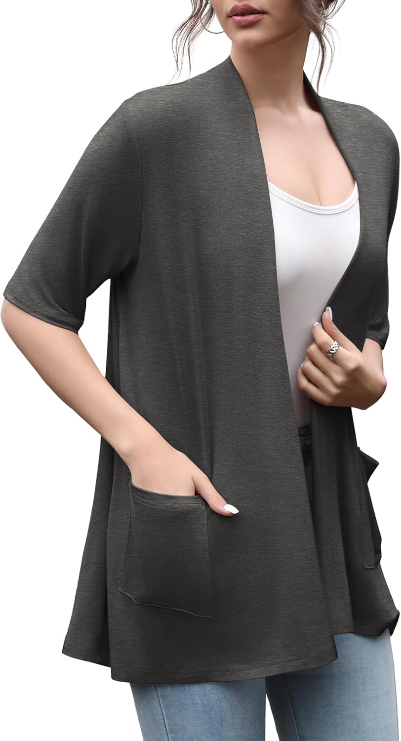HIYIYEZI Women's Short Sleeve Open Front Cardigan Casual Loose Lightweight Cardigans with Pockets