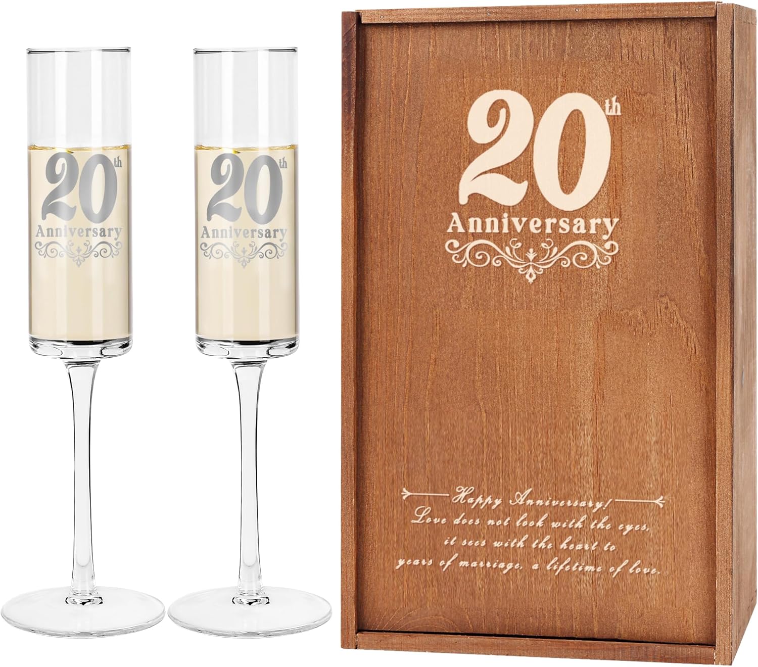 - Unique Keepsake: Both the champagne flutes and the wooden box are engraved with the 20th Anniversary inscription, offering a touch of elegance and sophistication. The wooden box can also be used as a storage box for photos or jewelry. This is the perfect way to commemorate 20 years of love and memories.