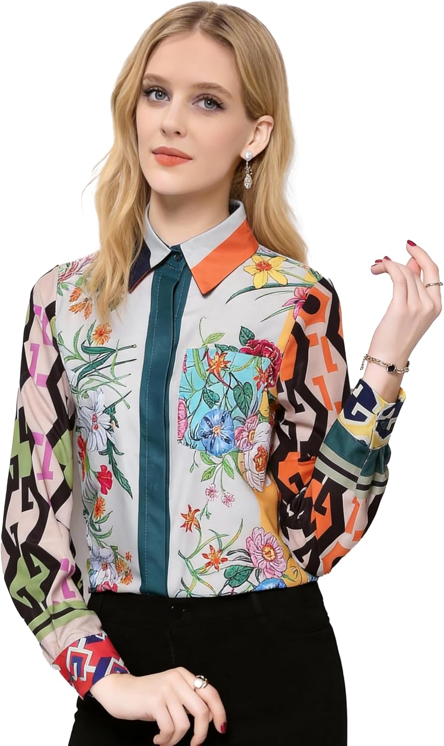 LAI MENG FIVE CATS Women's Shirt Floral Print Long Sleeve Button Down Casual Blouse Top