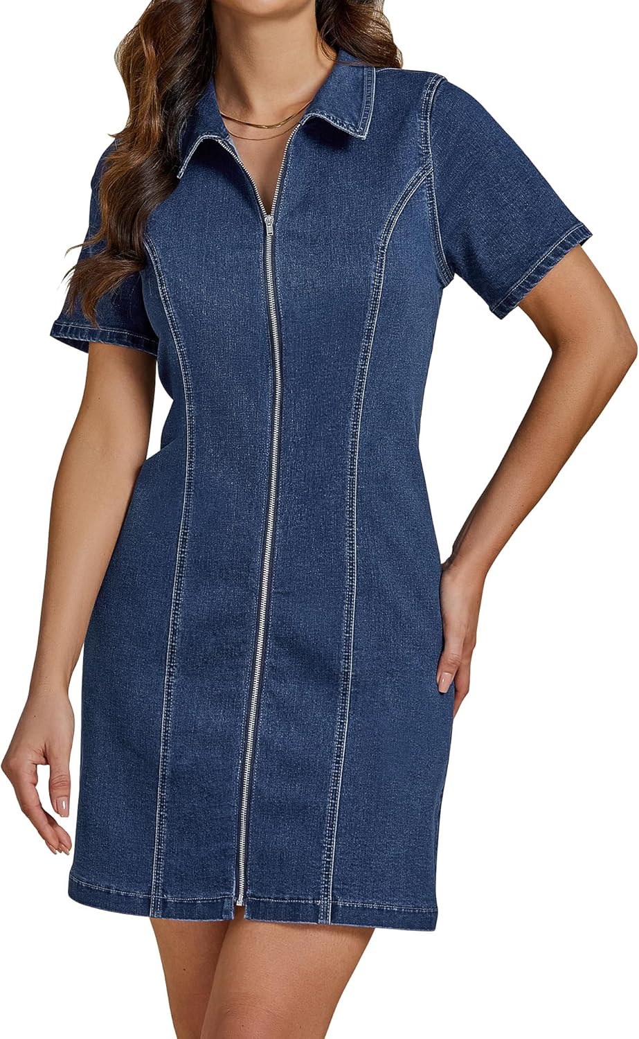 luvamia Denim Dresses for Women Summer Casual Zip Up Short Sleeve Western Short Stretchy Jean Dress with Pockets