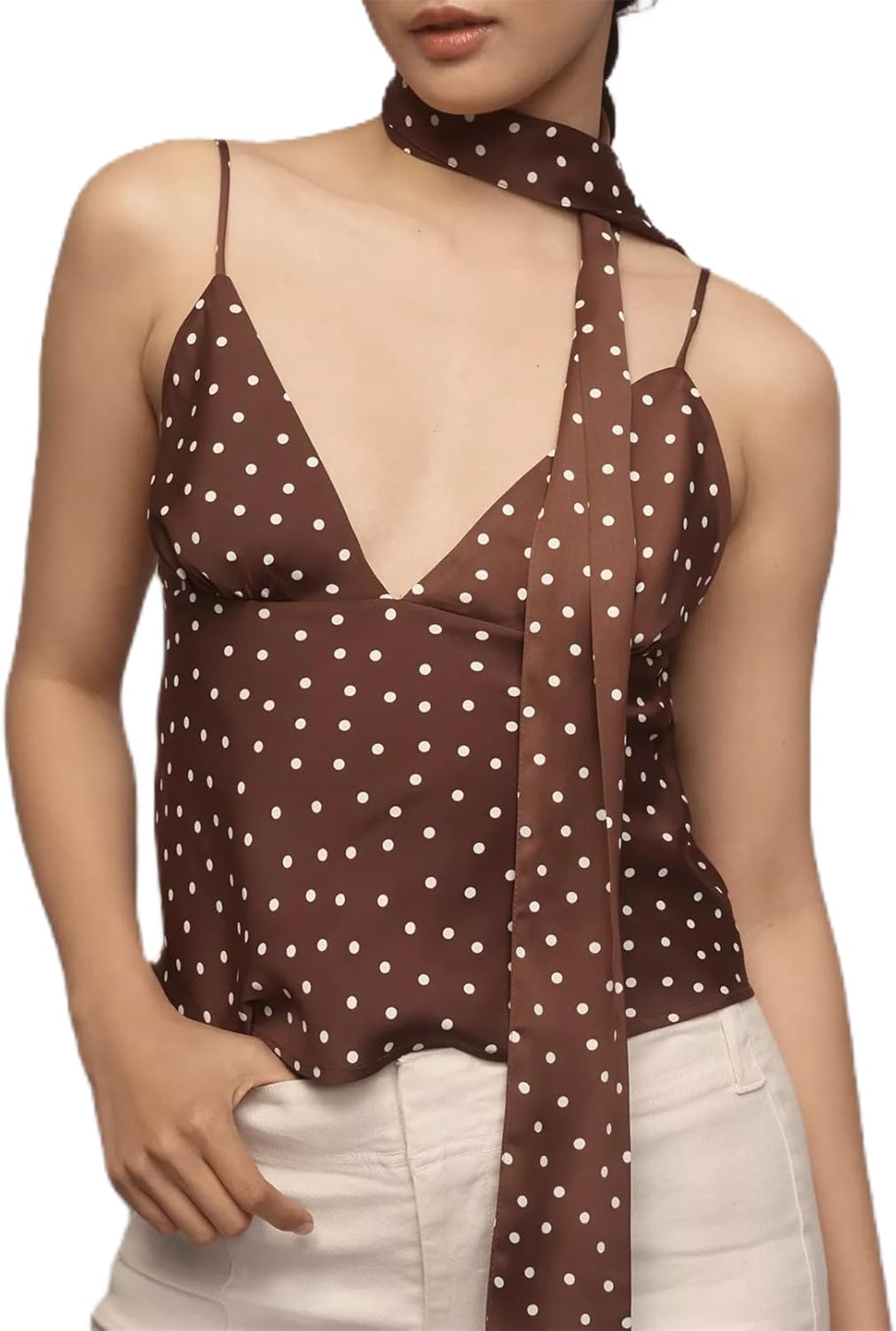 Women Y2k Cute Lace Trim Polka Dots Cami Crop Top Aesthetic V Neck Spaghetti Strap Sleeveless Camisole Going Out Top