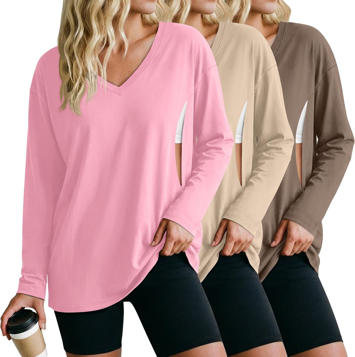 3 Pack Women's Oversize Nursing Shirts for Breastfeeding with Hidden Zippers Loose Fit Long Sleeve Maternity Tops(Pink, Apricot, Light Brown,Medium)
