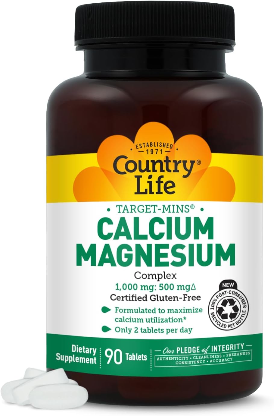 Country Life Target-Mins Calcium Magnesium Complex 1000mg/500mg, 90 Tablets, Certified Gluten Free, Certified Vegan, Certified Non-GMO Verified