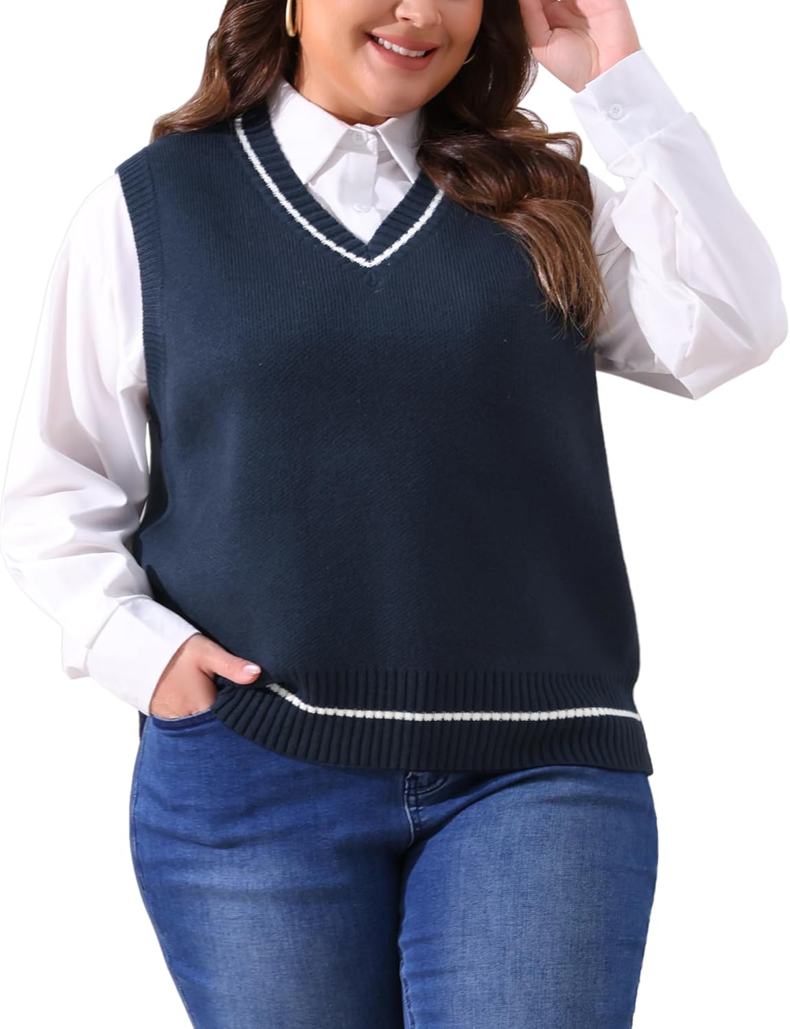 Agnes Orinda Plus Size Sweater Vest for Women V Neck Stripe Cable Knit Sleeveless Pullover Sweater Vest
