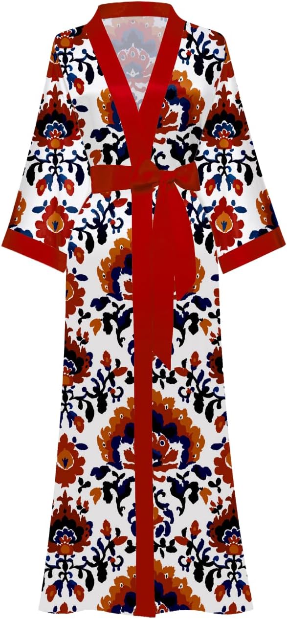 Women's Fancy Print Satin Kimono Robe, Soft Silky Lightweight, Long Wedding Bridesmaid Robes Fits Sizes 0-12