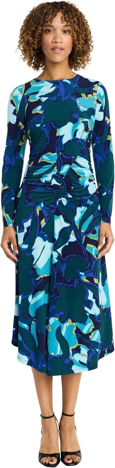 Maggy London Womens Women's Ruched Waist Crew Neck Long Sleeve Asymmetrical Hem - Elegant Midi Length - Wedding Guest Dress